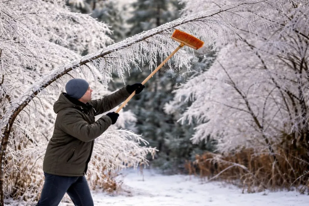 Ak sa konár výrazne prehýba, opatrné oklepanie ľadu môže stromu pomôcť. Dôležité je robiť to jemne a postupne, napríklad metlou alebo drevenou tyčou.
